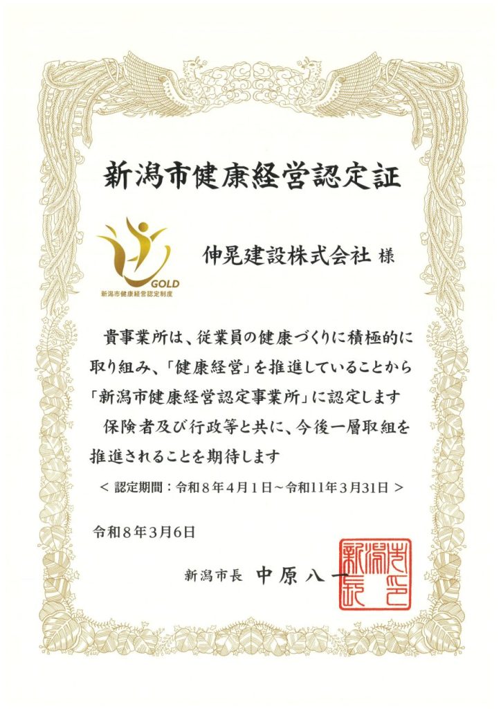 このたび、弊社は「新潟市健康経営認定制度」において、ゴールドクラスに認定されました。